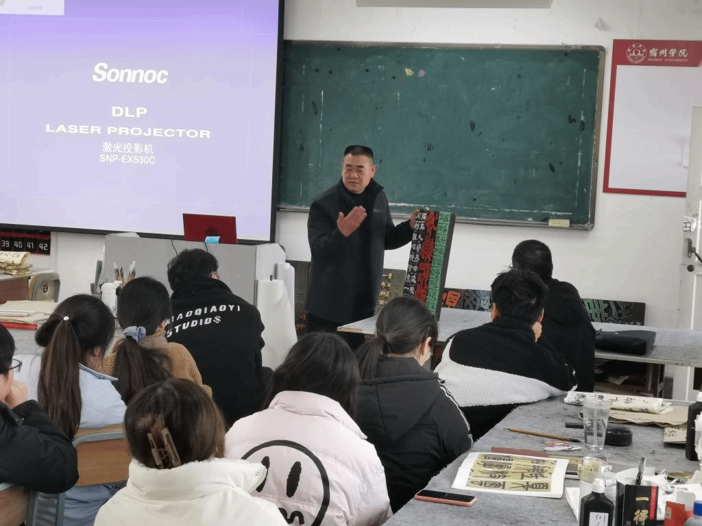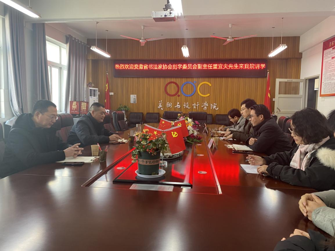 2021年12月14日上午,安徽省书法家协会刻字委员会副主任董宜夫老师受邀在艺术楼c501多媒体教室作了“现代刻字艺术的审美与发展”为题的学术讲座。讲座由美术与设计学院书法学教研室主任秦琴老师主持,美术与设计学院党委书记陈述立、院长许兴海教授及书法学专业全体教师和学生共计近70人参加。