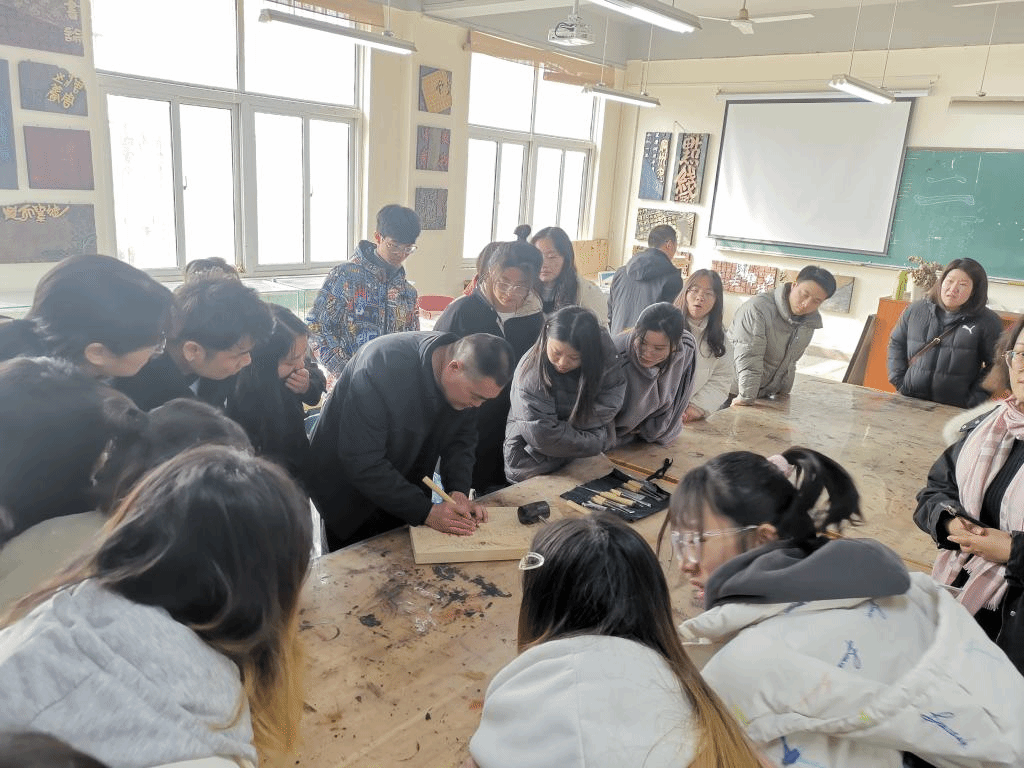 随后,董宜夫老师走进刻字实训室,先是对学生的作品进行点评与分析,随后在现场进行刻字技法示范,使学生更直观地感受刻字艺术之美。