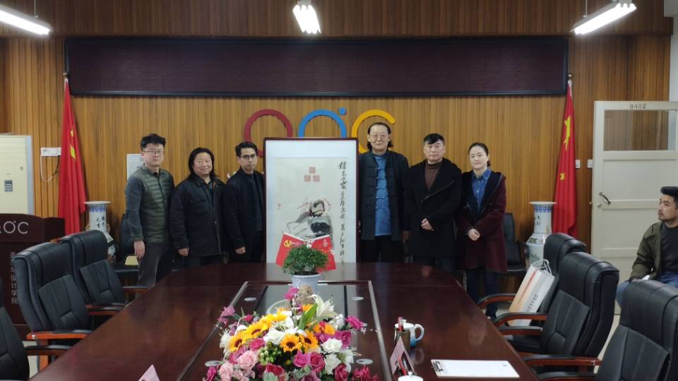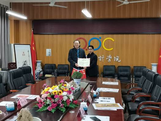 会上许兴海院长先是介绍了学院参加人员并致欢迎词,然后从学院历史沿革、人才培养、师资力量、学科建设等方面进行了详细介绍。接下来陈光林先生向学校赠送一幅钟馗画,由许院长代表学校向陈光林先生颁发了收藏证书。随后陈光林先生向大家介绍了灵璧钟馗画的艺术特色及审美价值,提到钟馗画扎根于安徽省民间,寄情于民俗,蕴雅于拙,寓美于丑,土而不陋,俗不伤雅,具有较高的艺术价值、文化价值和历史价值,在国内外都有很大影响。自唐代起,灵璧人始画钟馗。2003年,灵璧被文化部授予“中国民间艺术(钟馗画)之乡”称号。但在市场经济的大潮下,如何使日益衰落的灵璧钟馗画更好地延续文化传统,更好地发挥非物质文化遗产的重要文化功能,则需要整个社会的共同关注、国民文化综合素质的整体提高以及高校对民间艺术的教育普及才能使这一艺术样式更好的传承和发展下去。