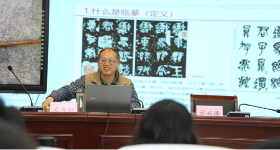 会上,许兴海首先介绍了主讲嘉宾并致欢迎辞。石海松围绕“书法临摹与书法创作的关系”为全体师生作了一场非常精彩的学术讲座。他认为,一要处理好实临与意临的关系;二要学会选帖;三要正确对待临帖的数量,兼学诸体、主攻一体;四要处理好临摹与创作的转换问题;五要做到个人素养与专业技法兼修并进。讲座最后,同学们积极互动,就自己在研习临摹和创作中遇到的一些问题同石海松进行交流,现场气氛活跃。