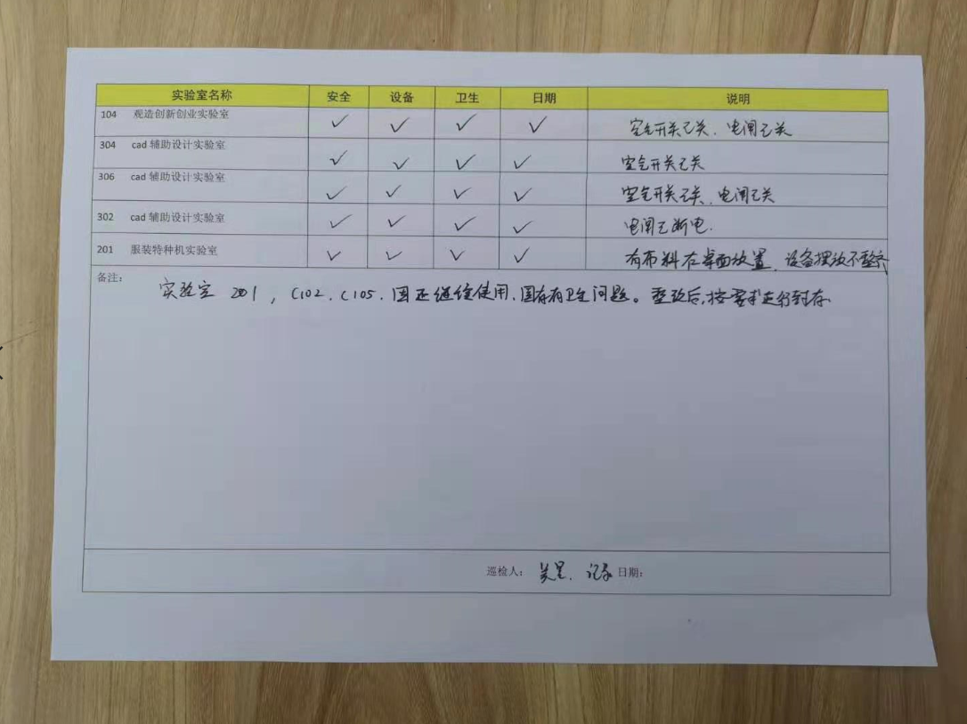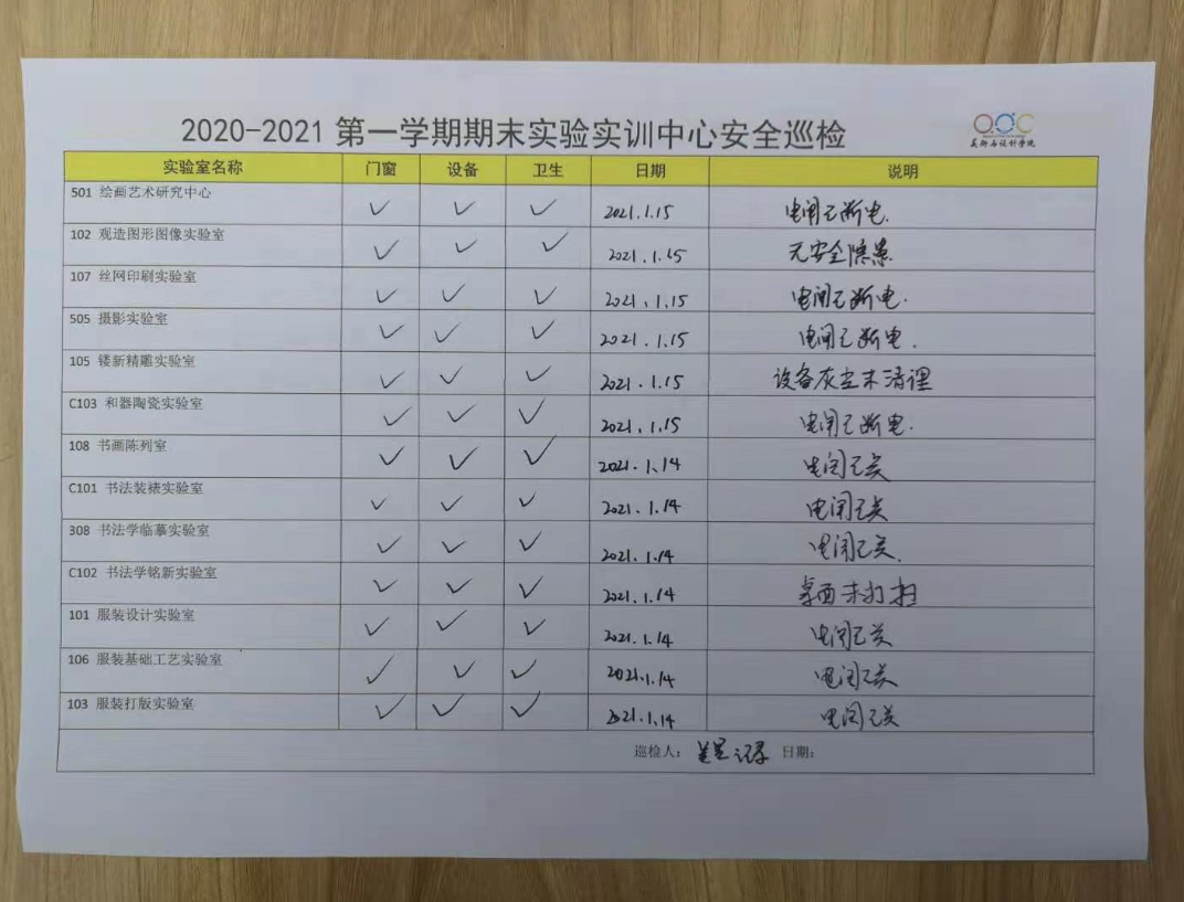 本次检查包含实验室使用记录,水电使用安全、消防安全、电气安全、设备安全等。在美术与设计学院书记陈述立,院长许兴海的带领下,检查小组重点检查了实验室安全制度及责任制落实情况。重点排查实验室水电使用是否存在安全隐患,实验室卫生及消防安全管理是否规范。