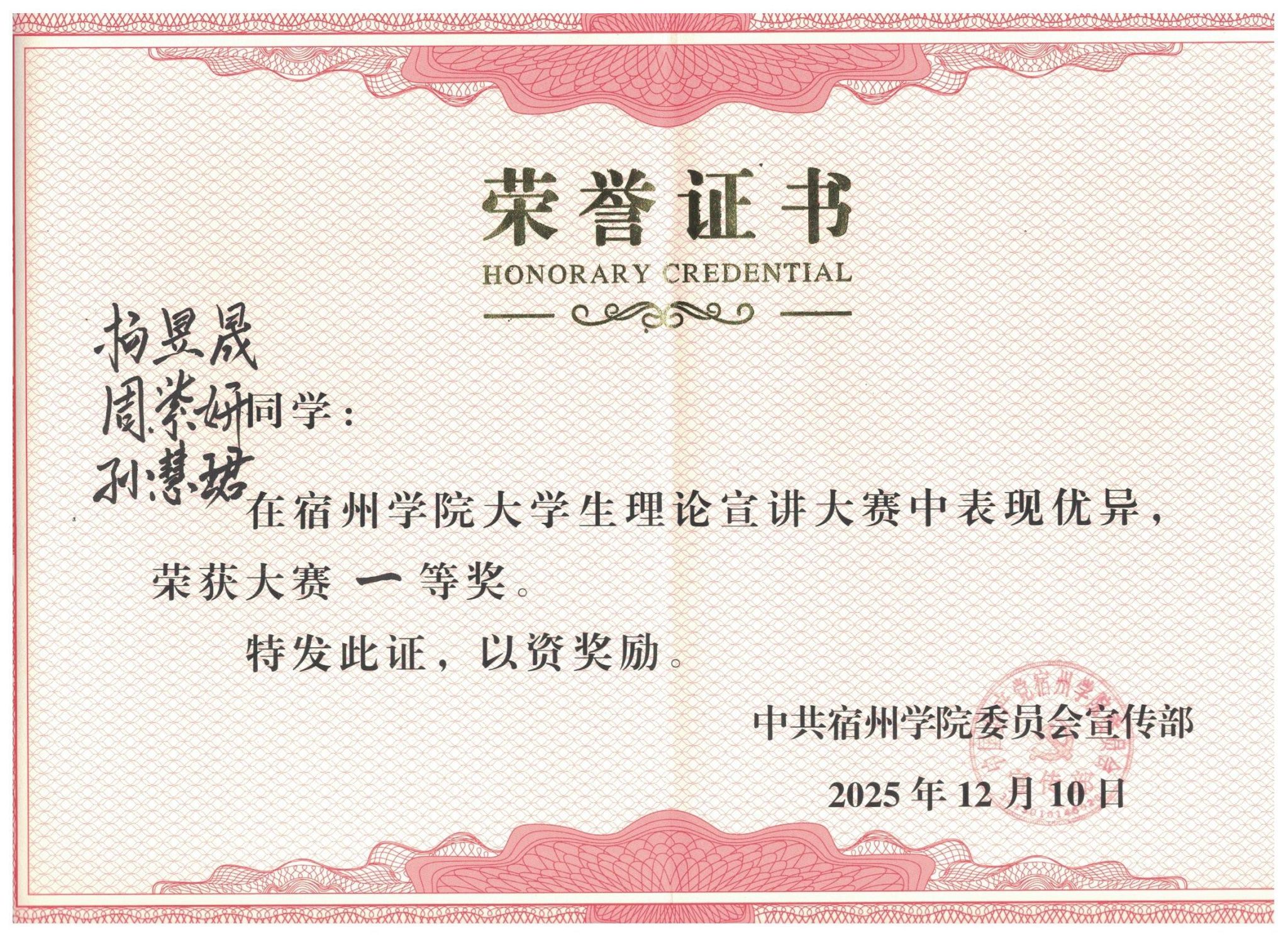 12月10日,宿州学院“立报国强国大志向 做挺膺担当奋斗者”大学生理论宣讲大赛圆满落幕。美术与设计学院选送的宣讲作品凭借“艺术赋能理论、青春诠释担当”的鲜明特色,在众多参赛作品中脱颖而出,荣获大赛一等奖。