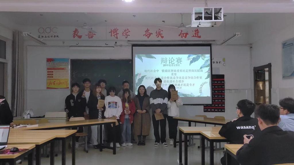 2021年4月23日晚上7点,20级环境设计3班在美术与设计学院C304教室举办了一场精彩绝伦的辩论赛。本次辩论赛由宣传委员和组织委员段国蓉、罗琳两位班委精心策划,并邀请了辅导员田聪老师作为嘉宾。真理越辩越明,辩论针对学生关心的问题展开,围绕“现代社会中情商比智商重要还是智商比情商重要”“现代社会中是合作比竞争还是竞争比合作更能促进社会进步”“现代社会中更需要通才还是专才”这三个主题。 通过对社会热点的激烈辩论,引发其对社会问题的深切关心与深刻思考,进而增加其对社会的关注度。对于观看学生而言,在观看辩论赛的过程中,思路不断地跟随辩手进行转变,不仅学会从多种角度看待问题,而且使其对社会问题全面了解,并主动思考社会问题的产生原因与解决途径。