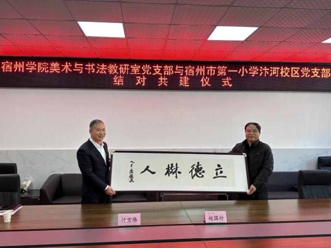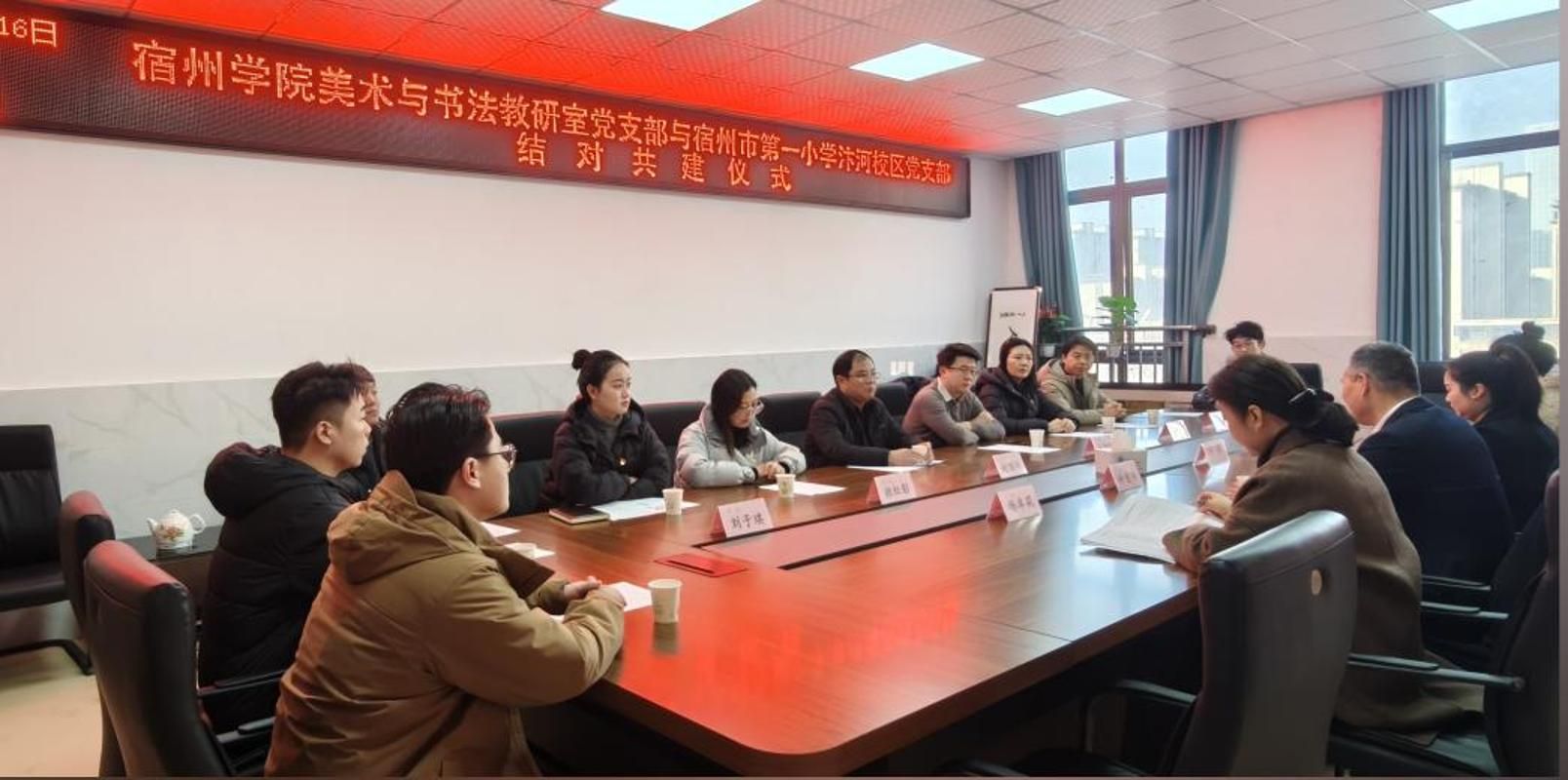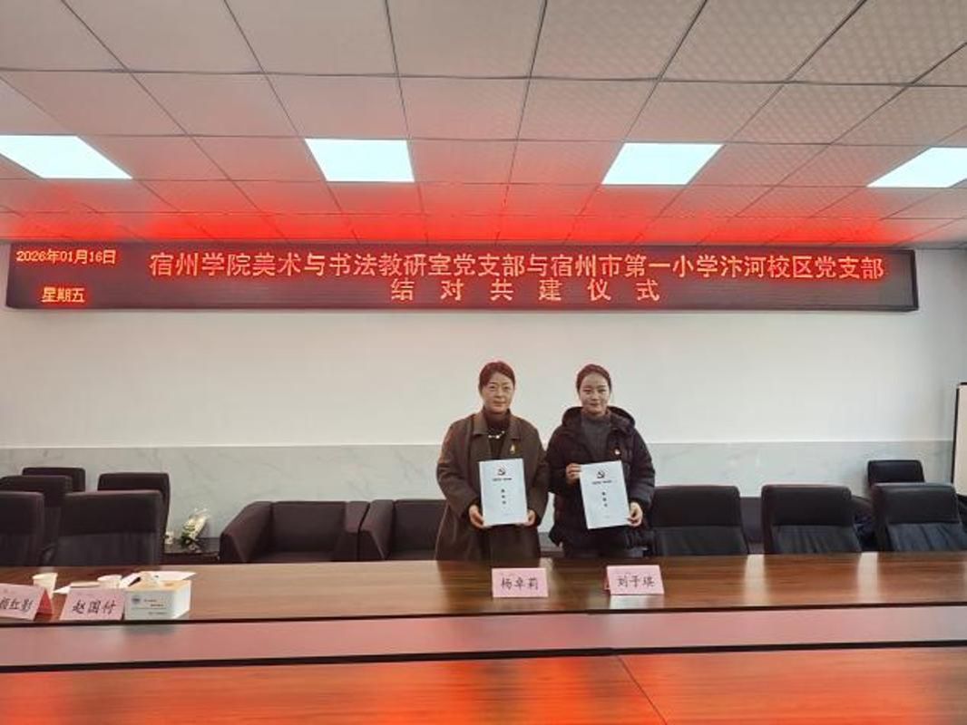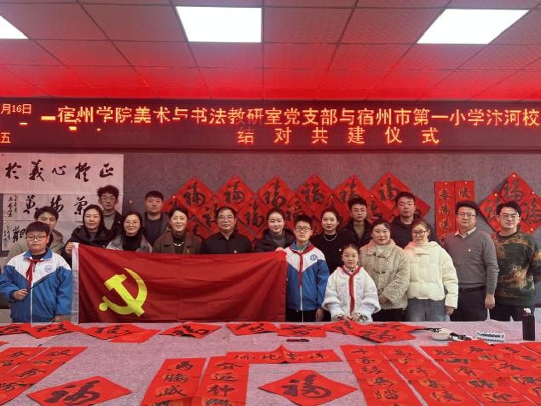 2026年1月16日,宿州学院美术与设计学院美术学与书法学教研室党支部与宿州市第一小学汴河校区党支部结对共建活动在宿州市第一小学付宏伟名校长工作室举行。此次活动以党建为纽带,深耕美育浸润使命,搭建校地美育协同育人平台,推动中华优秀传统文化进校园,在优势互补、共建共融中夯实基础教育美育根基。