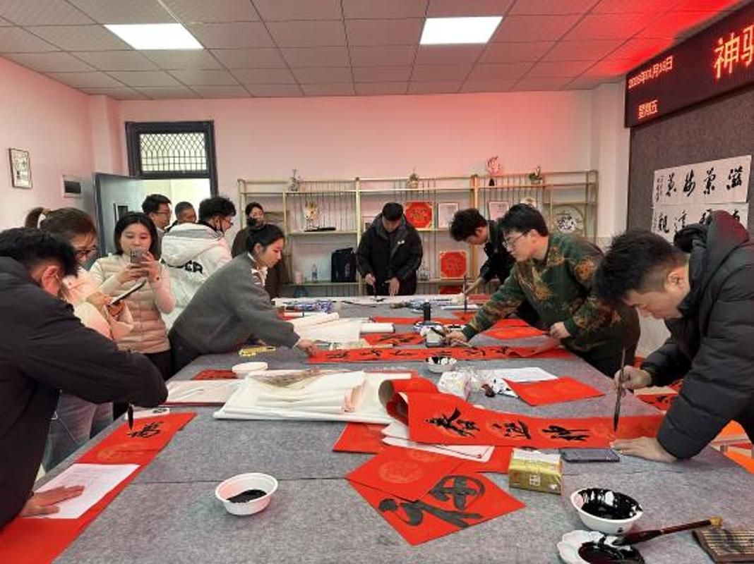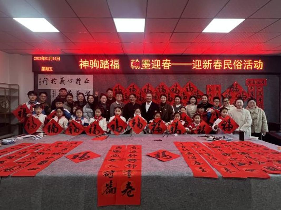 仪式后,宿州学院美术与设计学院与宿州市第一小学汴河路校区共同举办了“神驹踏福 翰墨迎春”主题党日活动。两个单位党组织的教师现场铺展红纸,挥毫泼墨,以笔为媒,将新春祝福融入笔墨之间。学生主动提笔尝试,在教师的悉心指导下体验书写乐趣,现场墨香四溢、暖意融融,洋溢着浓厚的新春氛围与文化气息。