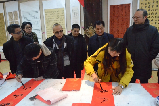 张灯结彩辞旧岁,挥毫泼墨迎新春。为弘扬优秀传统文化,赞美新时代,祈福贺新春,营造温馨祥和的气氛,2020年1月9日,由宿州学院共青团委员会、招生就业处、美术与设计学院(分工会)共同主办的“迎新春 送春联”春联书写活动在艺术楼一楼展厅开展。招就处杨刚处长、王北阳副处长,校团委凌峰副书记(主持工作),学生处贾学彬科长,美术与设计学院吴晓沛书记、许兴海院长、徐强副书记以及书法专业教师、学生参与。