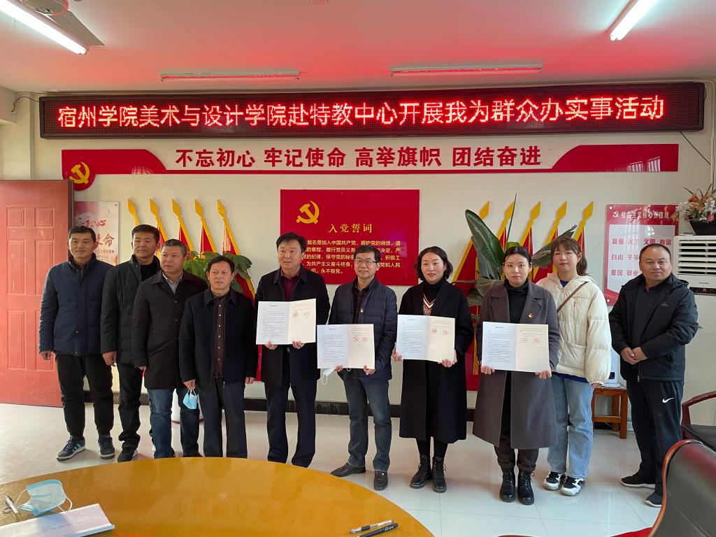 共建会上,宿州市特教中心党支部书记、校长尹成飞介绍了特教中心近年来的发展情况,边洪强介绍了宿州学院及美术与设计学院的概况。随后,双方单位签订了党建共建协议书,并向特校中心党支部赠送了学习用品。师生党员走进聋班、培智班等对学生进行了学习指导。双方单位以此次活动为契机,为以后的深入共建建立了坚实的基础。