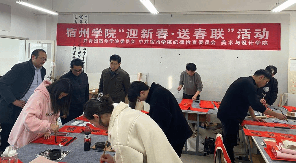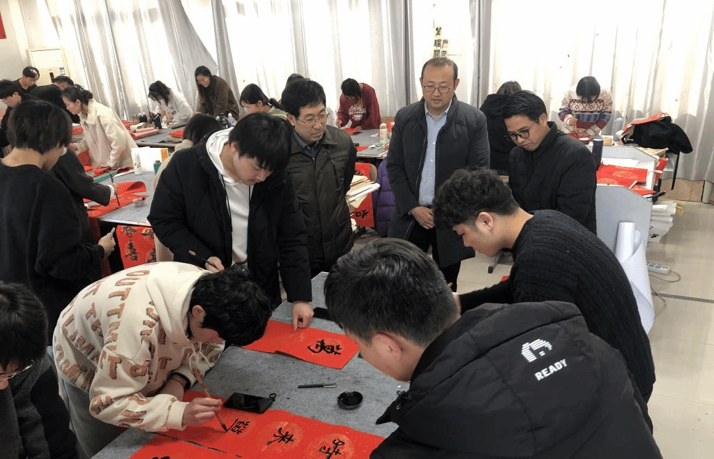 书法爱好者集中书写春联,校团委书记凌峰、美术与设计学院党委书记陈述立、副书记、院长许兴海亲临现场,为大家送上新春的祝福。