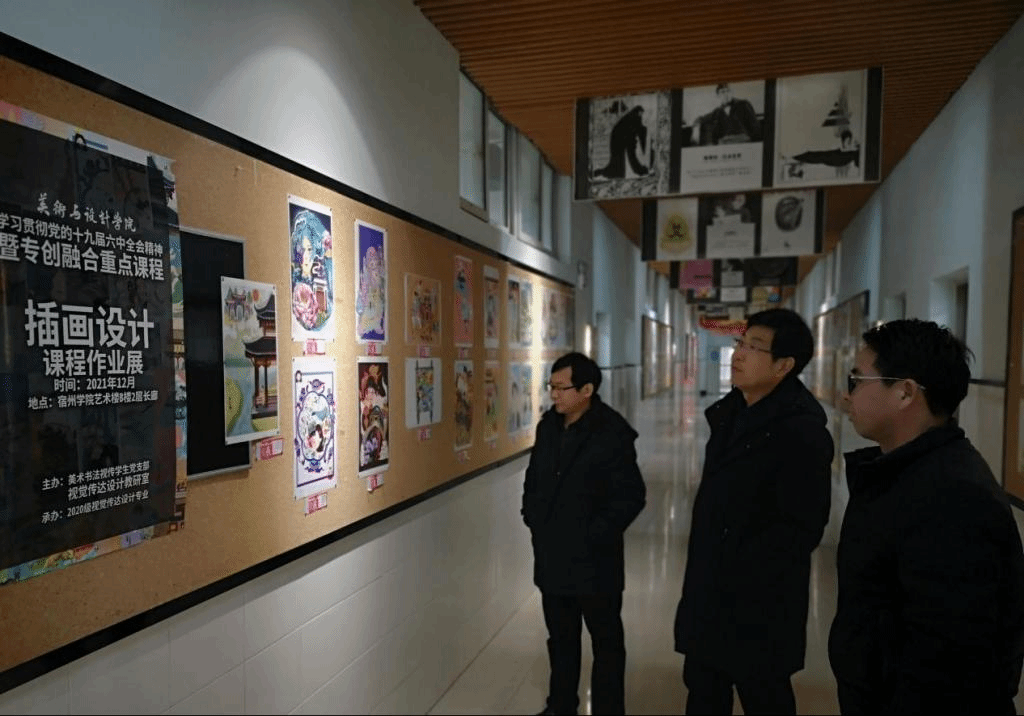 在深入学习贯彻党的十九届六中全会精神的氛围中,2021年12月29日视觉传达设计教研室和美术书法视传学生党支部联合主办,20级视传专业承办的“学习贯彻党的十九届六中全会精神暨专创融合重点课程——插画设计课程作业展”在艺术楼B楼二层举行,美术与设计学院党委书记陈述立,党委副书记、院长许兴海,党委副书记、纪委书记边洪强及全院师生参观了本次展览。