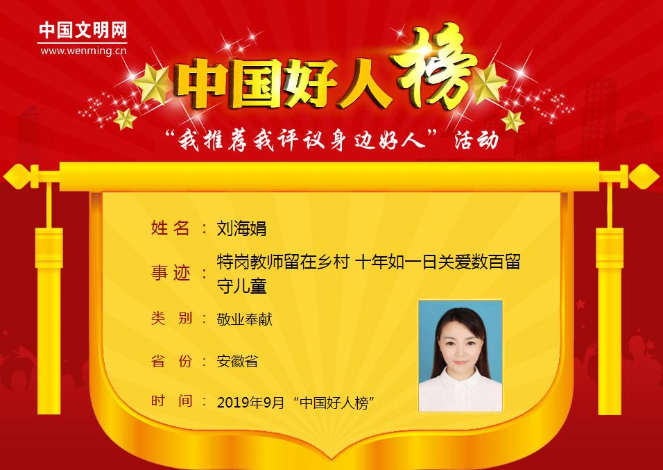 刘海娟,中共党员,2009年毕业于宿州学院美术教育专业。现为安徽省阜南县新村镇中心小学教师。安徽省青年美术家协会会员,先后获得“中国好人”、“全国优秀教师”、“全国优秀乡村青年教师培养对象”、“安徽好人”、“安徽省最美教师”、“安徽省优秀指导教师”、“安徽省委讲师团专家库青年宣讲名师”、“安徽省优秀教师先进典型”、“安徽青年五四奖章”、“阜阳市骨干教师”等荣誉称号。她的感人事迹多次被《中国教师报》、《中国教育报》、《人民网》、《安徽新闻联播》、《安徽日报》等各大媒体争相报道,成为青年教师学习的榜样。