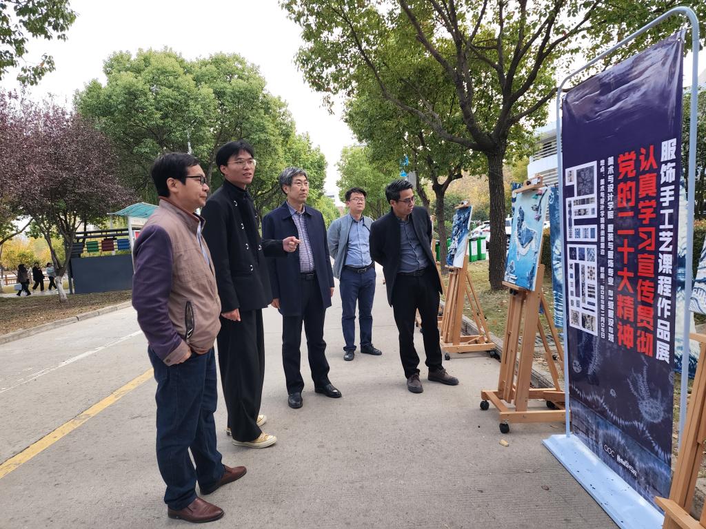 为深入学习宣传贯彻党的二十大精神,汲取伟大力量,迈向全新征程,2022年11月2日,在美术与设计学院党委的指导下,由视传服设教师党支部和环境服饰学生党支部联合主办,21级服设专业师生承办的“认真学习宣传贯彻党的二十大精神——服饰手工艺课程作品成果展”主题党日活动在艺术楼旁闵贤路边举行,美术与设计学院党委书记陈述立,党委副书记、院长许兴海,党委副书记、纪委书记边洪强及全院师生参观了本次展览。