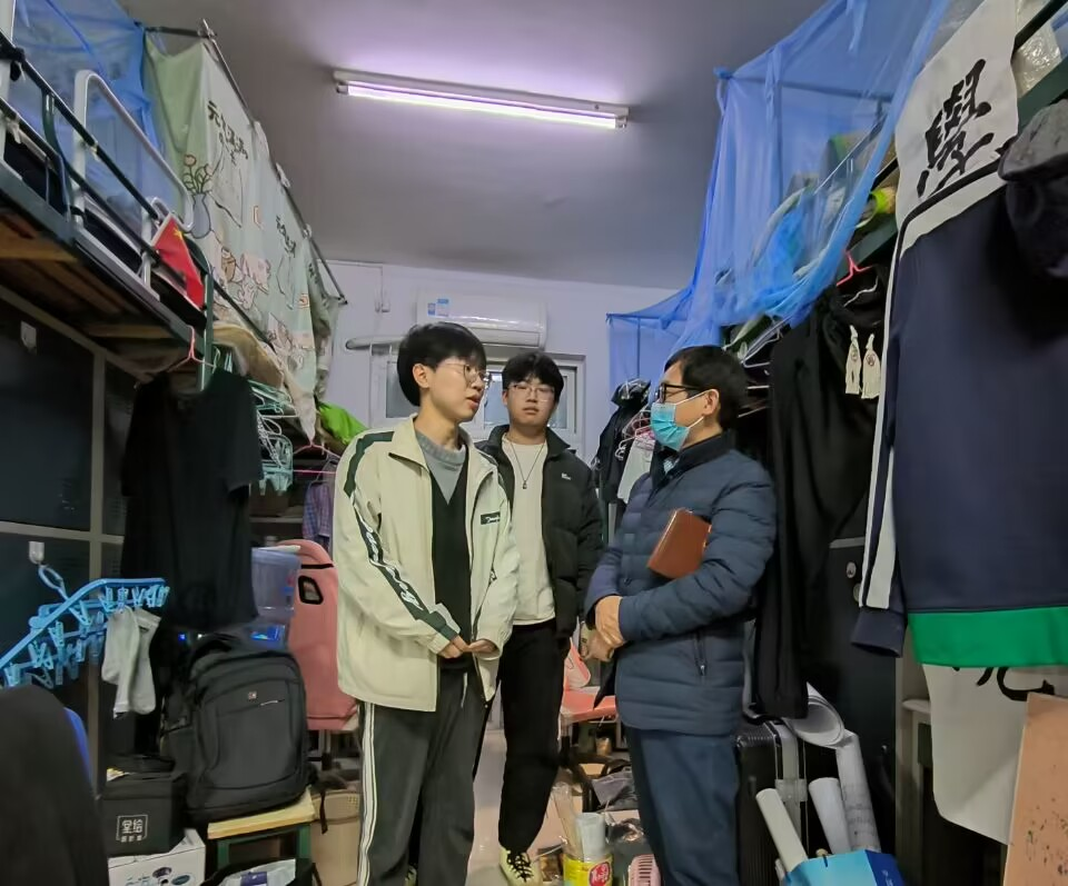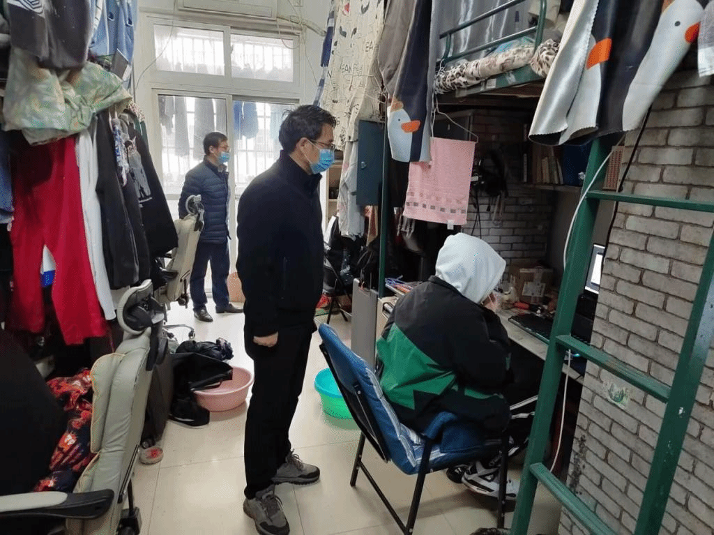 走访过程中,学院一行人对宿舍里可能存在的安全隐患进行排查,提出了宿舍的安全和卫生问题,叮嘱同学们一定要做好自我防护,多通风,勤洗手,在公共场合佩戴口罩。学院领导和辅导员与同学们亲切交流,深入了解并解答大家对疫情防控生活中遇到的问题和疑惑,对于个别特殊困难的同学,辅导员老师也单独进行谈心谈话。许兴海强调,当前特殊时期,希望同学们理解配合,一是要遵守学校的相关防疫工作要求。二是提高自我防护能力,学习防控知识。三是学会自律,专业学习不停歇。四是保持乐观心态,合理安排学习生活,加强体育锻炼。