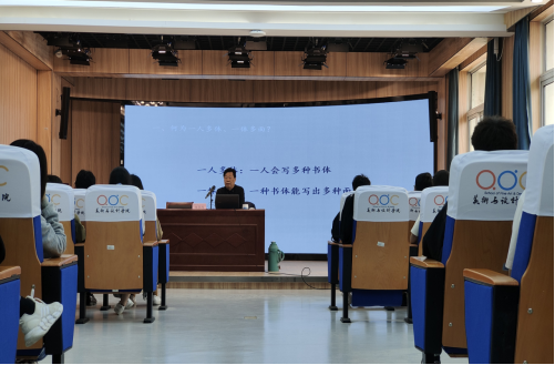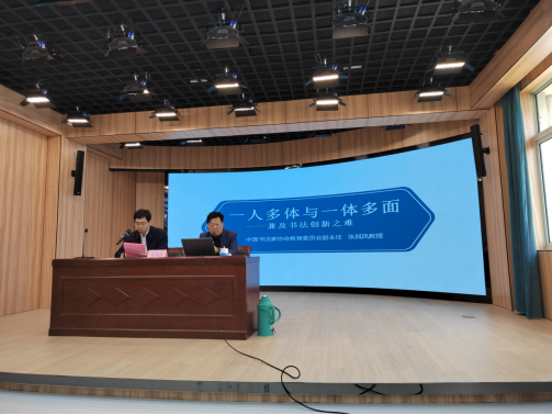 接着,张其凤教授为我院师生开展了题为“一人多体与一体多面”的学术讲座,他的讲座体现了知识面的丰富和清晰的结构层理。讲座中清晰的说明了如何认识法帖、怎么学习法帖、如何变化理解等等,为学生今后的学习梳理了方向和找到突破口,对今后的书法创作提供了思路。同学们也积极提出问题并参与讨论,张其凤教授对同学们提出的问题给予作答,现场气氛活跃。