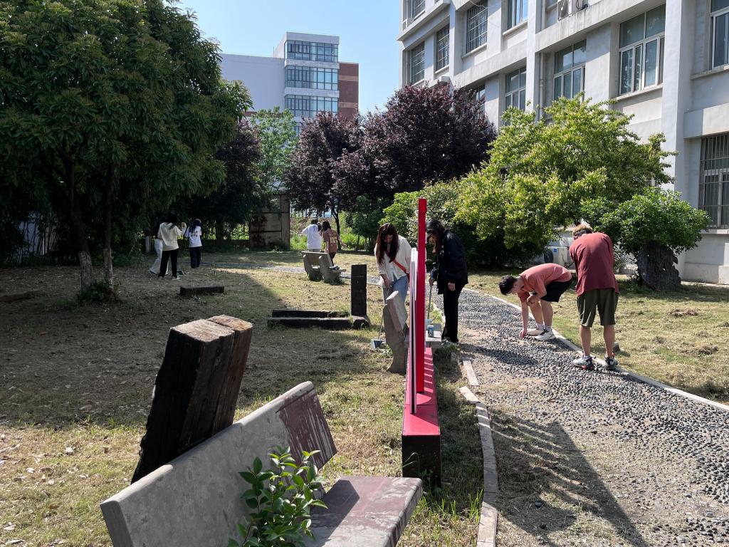 伴随着烈日炎炎的骄阳,参加校园清扫志愿活动的同学们来到美术与设计学院B楼与C楼交界处集合,并着手打扫该地卫生。每个同学带着清洁工具在划分好的各个区域,清扫学院内的枯枝落叶、杂草杂物,以及花坛里的烟头纸屑。