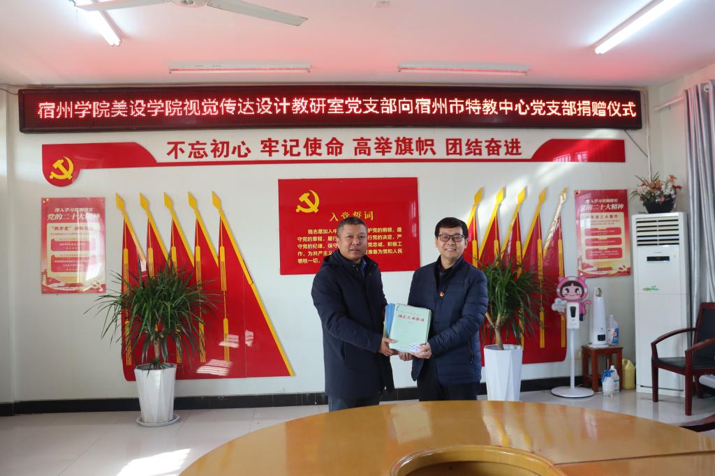 12月8日,美术与设计学院走进宿州市特殊教育中心,开展“党建共建共享和志愿服务”签约仪式暨捐赠活动。党委副书记、纪委书记边洪强,视觉传达设计教研室党支部书记王子婷等参加了此次活动。