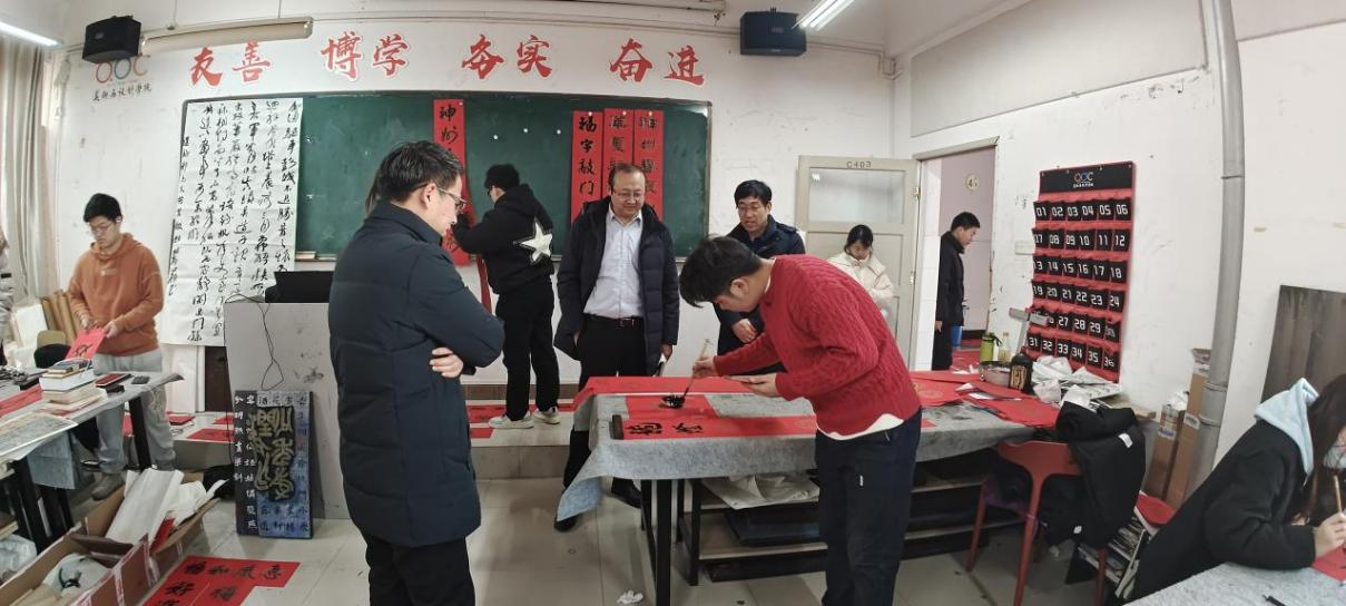 “千门万户曈曈日,总把新桃换旧符”,红纸黑字,是中国人迎接新春特有的传统文化。1月4日-5日,由校工会、团委主办,美术与设计学院承办的“迎新春•送春联”活动如期开展。工会主席郭良宗,副主席谷坤,校团委书记凌峰,副书记陈宇,美术与设计学院党委书记陈述立,党委副书记、院长许兴海,副书记、纪委书记边洪强,书法学教师及学生参加本次活动。