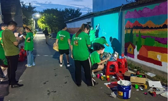 习近平总书记教导青年大学生,“学到的东西,不能停留在书本上,不能只装在脑袋里,而应该落实到行动上,做到知行合一、以知促行、以行求知。”为了开展好此次艺术实践活动,美术与设计学院和校团委指导老师与大学生一起开展了头铺镇乡村文化背景调研,通过访谈相关学生、搜集资料等多种途径,详细了解当地的民风民俗和村民需求,围绕赋能乡村振兴主题,精心制定了彩绘活动方案,确保彩绘既体现乡村振兴、地方特色,又积极向上、生动活泼。六天的时间,实践团队成员无畏炎炎酷暑,深入方台村多地,手持画笔与颜料,运用专业技能,把乡村振兴战略、社会主义核心价值观、乡村优秀文化、文明新风等元素巧妙地融入到墙绘作品中,将一幅幅精美逼真、寓意深刻的作品呈现在墙面上,使原本空白的墙面变得五彩斑斓、生动活泼起来,成为乡村一道道亮丽的风景线,受到当地村民的欢迎和肯定,纷纷表示“学生们画得好,颜色图案很特别,看着心里开心起来。”这些墙绘促进了文化艺术与文明新风深入乡村和民心,不仅美化了乡村环境,更传递出积极向上的文化内涵,激发了村民们对美好生活的向往和追求,为乡村振兴注入了新的活力。