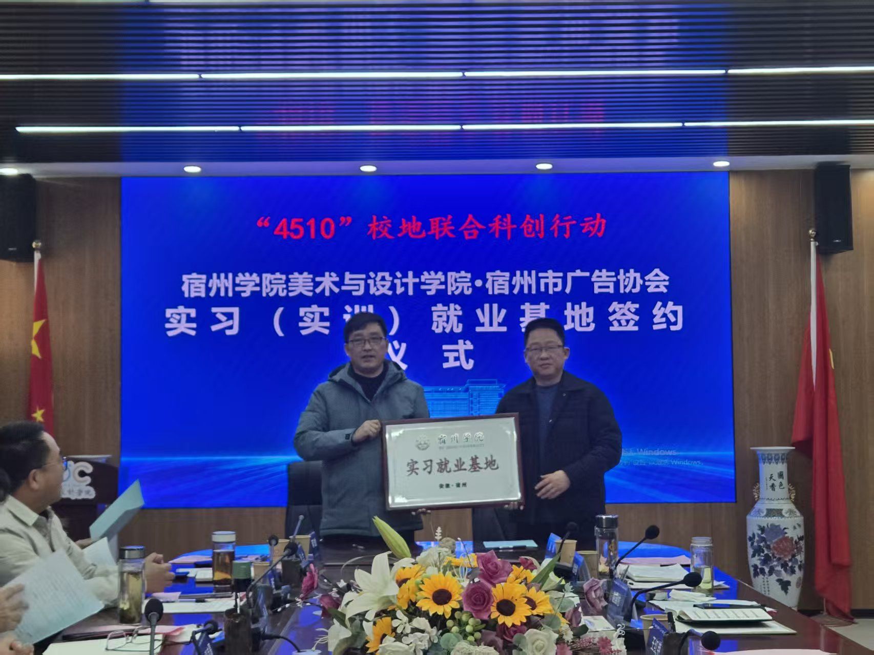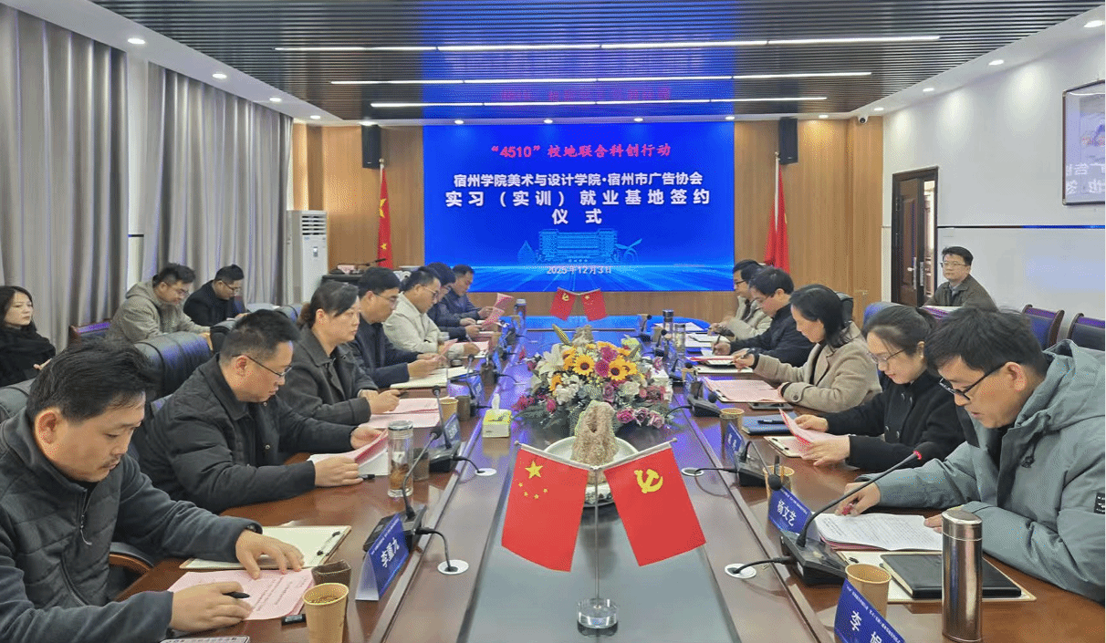 为深入推进“4510”校地联合科创行动,搭建一个资源共享、优势互补、协同育人、服务社会的合作平台,推进教育链、人才链与产业链、创新链的有机衔接。2025年12月4日,美术与设计学院与宿州市广告协会共建实习(实训)就业基地签约仪式在美术与设计学院会议室举行。