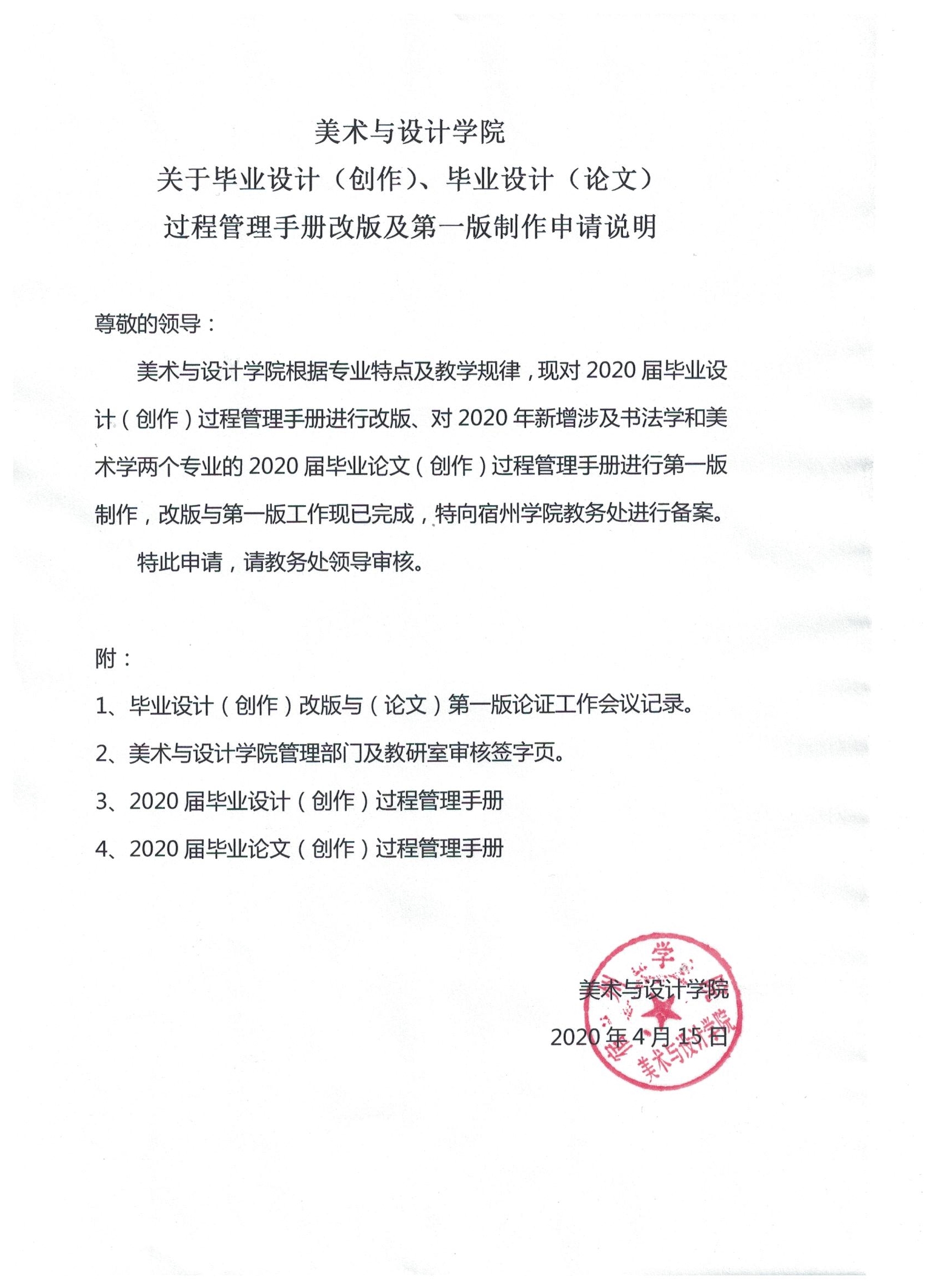 美术与设计学院根据专业特点及教学规律,现对《2020届毕业设计(创作)过程管理手册》进行改版,对新增涉及美术学和书法学两个专业的《2020届毕业论文(创作)过程管理手册》进行第一版制作。改版与第一版工作完成,并已向宿州学院教务处进行备案,现向学院师生发布。