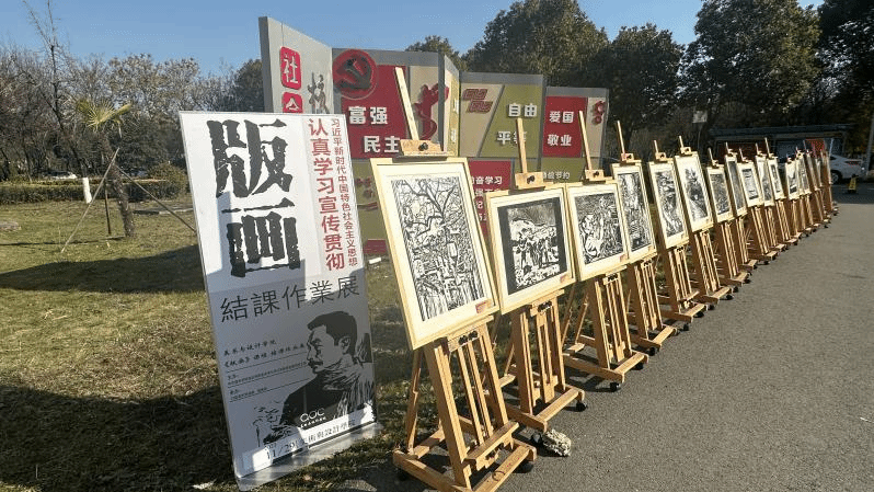为认真学习宣传贯彻习近平新时代中国特色社会主义思想,2023年11月29日,在美术与设计学院党委的指导下,由美术学与书法学教研室党支部主办、22级美术学专业学生承办的“认真学习宣传贯彻习近平新时代中国特色社会主义思想——美术与设计学院《版画》课程结课作业展”在美术与设计学院艺术楼B楼前举行。