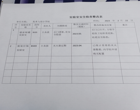 此次重点检查的实验室有服装打版实验室、观造图形图像实验室、镂新雕刻实验室。服装打版实验室主要是灭火器过期问题,镂新雕刻实验室主要是后门堵塞,有安全隐患。